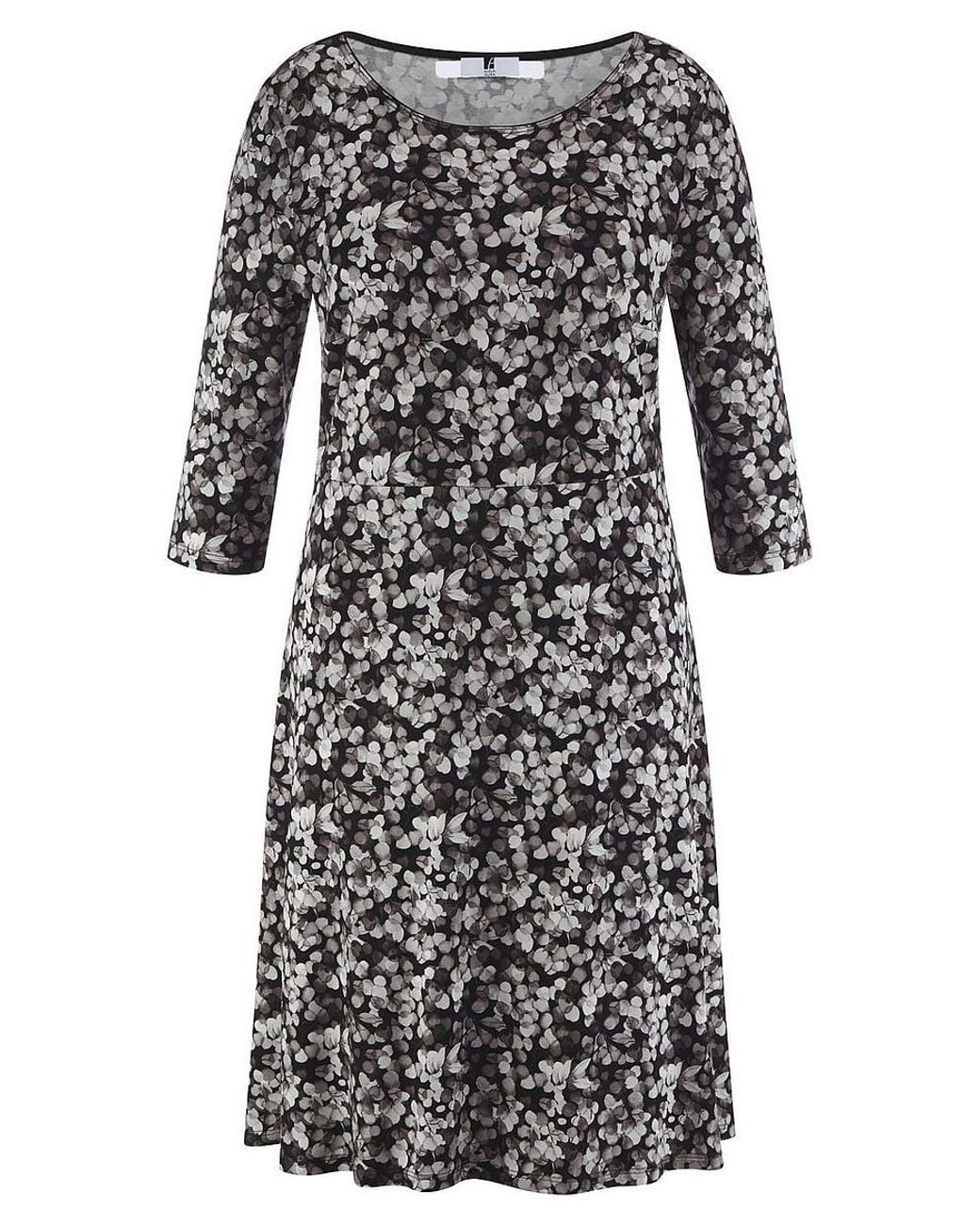 Jersey-Kleid von ANNA AURA mit 3/4-Arm, eingefasstem Rundhals-Ausschnitt und Teilungsnaht in der Taille. Figurwunder mit Wohlfühl-Aspekt. Rundum bequem in gerader Form aus hochwertigem Jersey in 95% Viskose, 5% Elasthan mit einem Print in edlen Grautönen. Zertifiziert nach Standard 100 by OEKO-TEX®. Länge in Größe 42 ca. 102 cm. Dieses Jersey-Kleid ist maschinenwaschbar. Schonwaschgang 30°. Chlorbleiche nicht möglich. Mäßig heiß Bügeln. Reinigung P. Trocknen im Tumbler nicht möglich. Farbe: Schwarz/Grau. Erhältlich in den Größen: 40, 42, 44, 46, 48, 50, 52, 54, 56