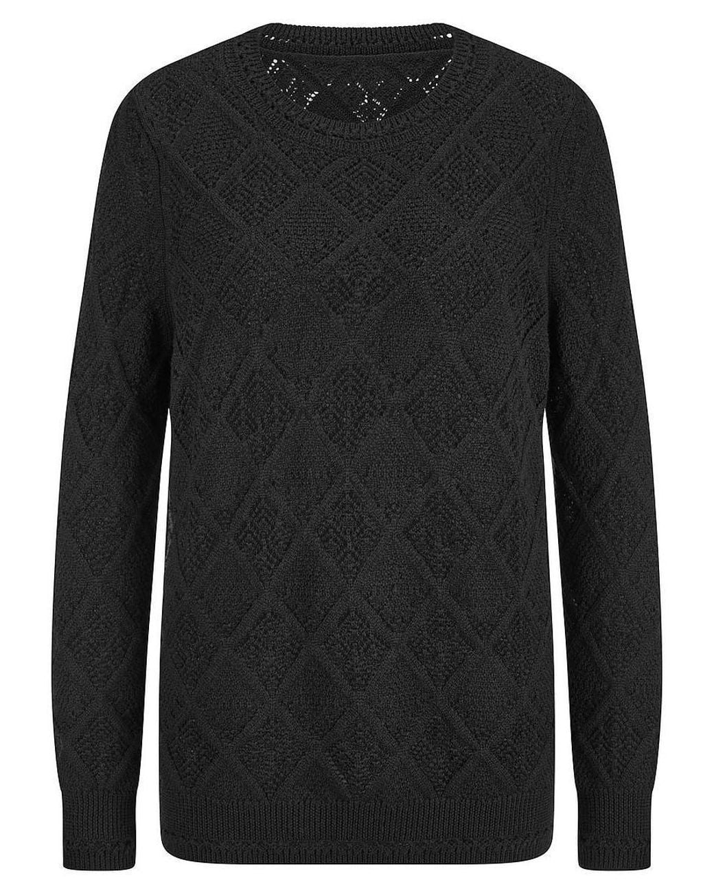 Rundhals-Pullover von ANNA AURA mit 1/1-Arm. Trendig, edel und zu vielen Outfits passend. Leicht transparentes, grafisches Ajour-Muster und hochwertige Naturqualität machen die besondere Klasse dieses Pullis aus. 100% Schurwolle. Länge in Größe 42 ca. 65 cm. Dieser Rundhals-Pullover ist maschinenwaschbar. Spezial Schonwaschgang 30°. Chlorbleiche nicht möglich. Nicht heiß Bügeln. Reinigung P. Trocknen im Tumbler nicht möglich. Farbe: Schwarz. Erhältlich in den Größen: 46, 48, 50, 52, 54