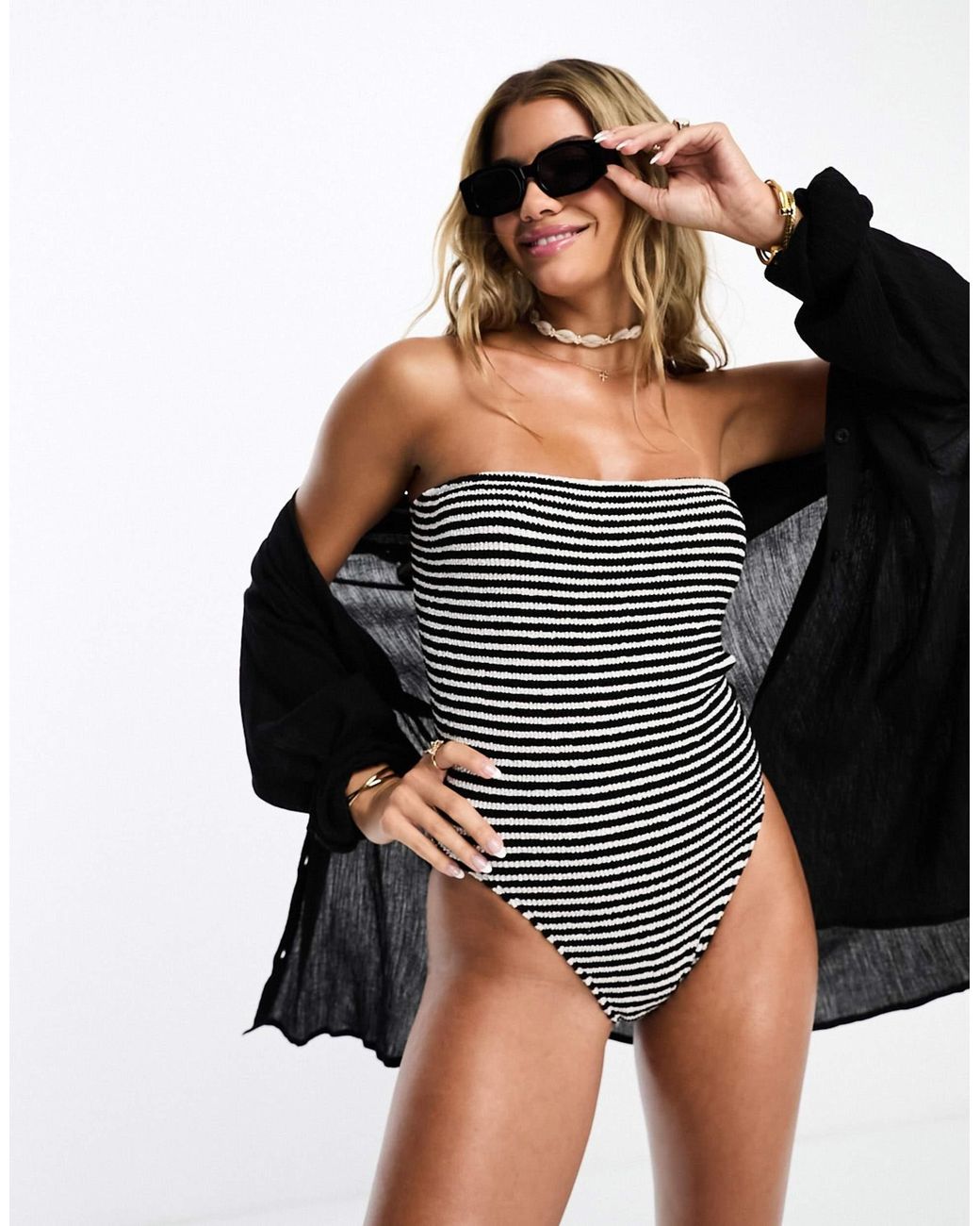 Bademode& Beachwear von ASOS DESIGN für den lang ersehnten Tag am Strand Streifendesign Bandeaustil Rückenausschnitt Slip-Schnitt konzipiert für die Größen UK 4 bis 14. Farbe: schwarz