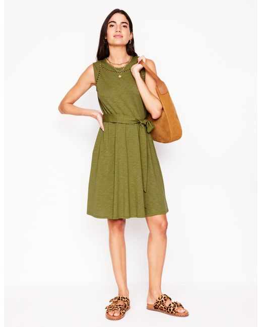 Bei unserem ärmellosen Mila Kleid dreht sich alles um die Details (genauer gesagt um den Bommelbesatz). Es begeistert außerdem mit einem gestuften Rock und einem Taillengürtel. Boden Mila Kurzes Jerseykleid mit Besatz in Grün | Größe 40