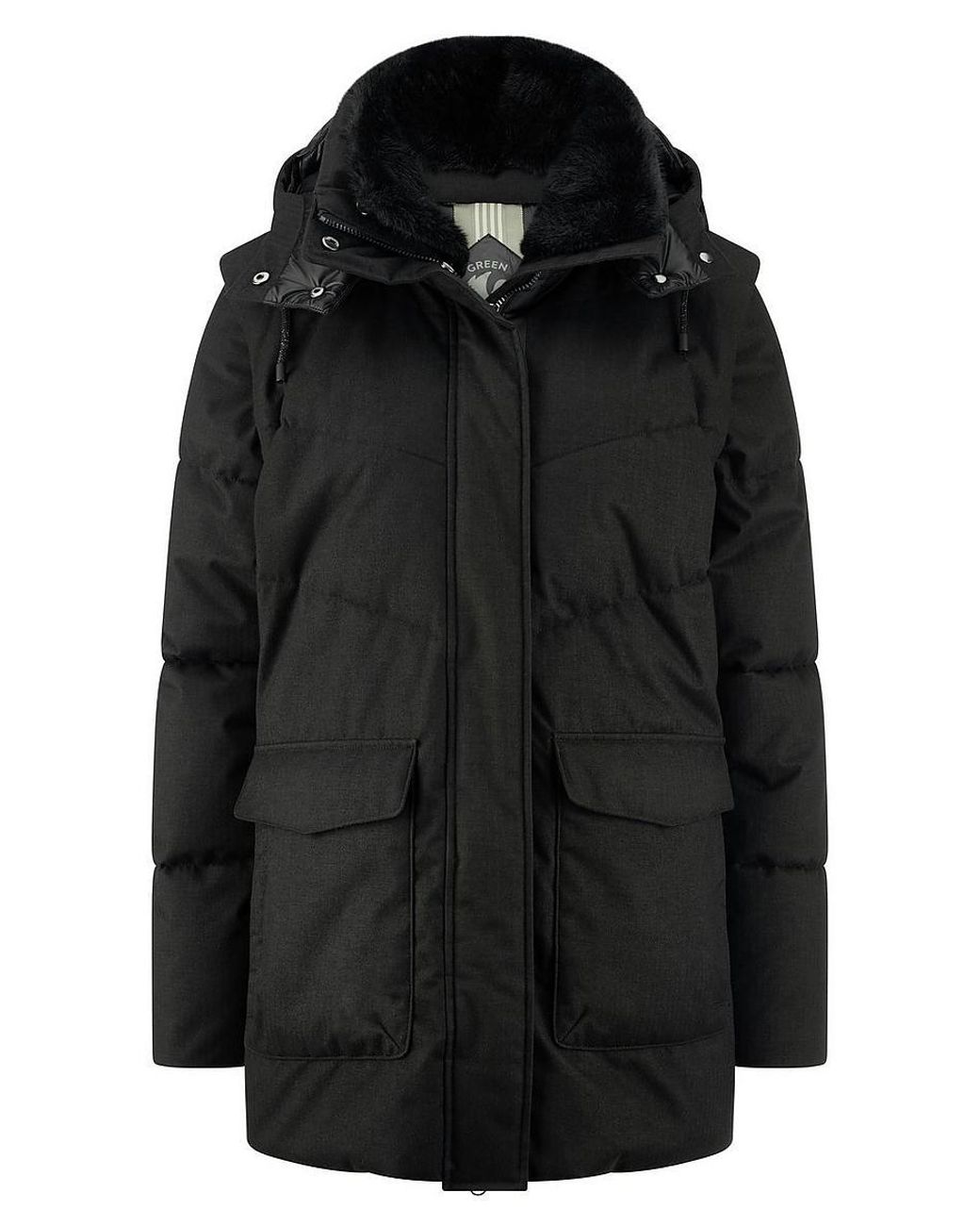 2-in-1-Jacke von WEGA GREEN GOOSE: dank per Reißverschluss abnehmbarer Ärmel und einer abnehmbaren Kapuze mit weichem, ebenfalls abnehmbarem Webpelz-Kragen. Futter in der Kapuze und der untere Part des Rückens aus glänzender, gesteppter Mikrofaser in 100% Polyamid. Mit verdecktem 2-Wege-Reißverschluss und verdeckter Druckknopfleiste, Taillentunnelzug mit innen liegenden Stoppern im Rücken, 2 aufgesetzten Pattentaschen und zusätzlichen Reißverschlusstaschen, einer Reißverschluss-Innentasche sowie Seitenschlitzen mit Druckknopfverschluss. Der Oberstoff aus Mikrofaser wurde mit der ökologischen Imprägnierung BIONIC-FINISH® ECO wasser-, wind- und schmutzabweisend ausgerüstet. 100% Polyester. Wattierung 100% Polyester. Futter 100% Polyamid. Länge ca. 76 cm. Diese 2-in-1-Jacke ist maschinenwaschbar. Schonwaschgang 30°. Chlorbleiche nicht möglich. Nicht Bügeln. Reinigung P. Trocknen im Tumbler nicht möglich. Farbe: Schwarz. Erhältlich in den Größen: 36, 38, 40, 42, 44, 46, 48, 50