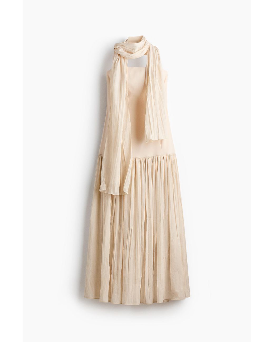 Langes Kleid mit einem figurbetonten Oberteil aus festem Webstoff und einem voluminösen Rockteil aus zartem, leicht gecrinkeltem Gewebe. Verdecktes Silikonband oben, verdeckter Reißverschluss mit Häkchenverschluss im Rücken und eine geraffte Naht auf Hüfthöhe. Zum Design dieses Kleids gehört ein passender Schal aus zartem, leicht gecrinkeltem Gewebe für verschiedene Stylingoptionen. Teilgefüttert. Farbe: natur