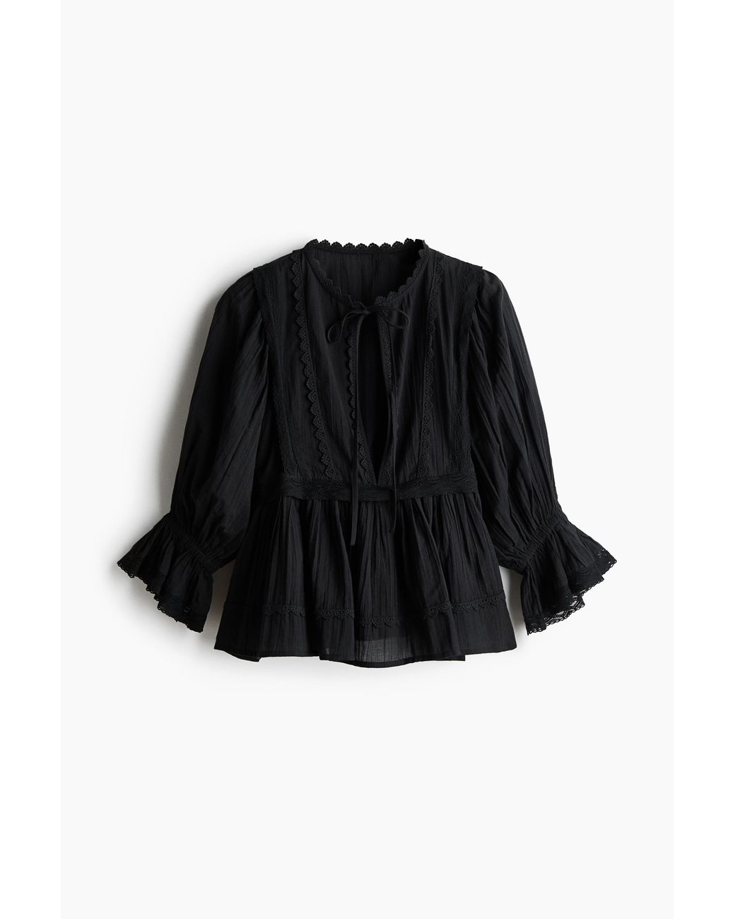 Bluse aus luftiger Baumwolle mit Picot-Besätzen. Modell mit Rundausschnitt und einer tiefen V-Öffnung vorn mit schmalen Bindebändern. Lange Ballonärmel mit schmalem Gummizug am Handgelenk und ausgestelltem Abschluss. Spitzenbesetzte Teilungsnaht mit Raffungen und ein ausgestelltes Peplum. Farbe: schwarz