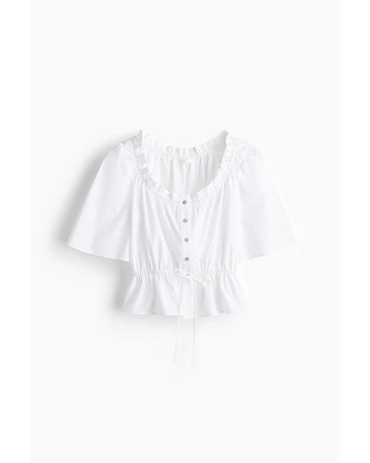 Kurze Baumwollbluse mit Volantbesatz am U-Ausschnitt, Knopfleiste vorne und ellenbogenlangen Ärmeln. Der schmale Gummizug und der Kordelzug über dem Saum erzeugen ein ausgestelltes Peplum. Farbe: weiß