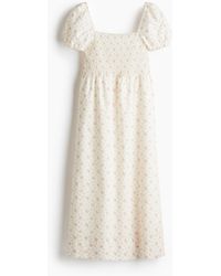 Weiter zu H&MKurzes, locker geschnittenes Kleid aus einem zarten, gecrinkelten Baumwollstoff mit Spitzeneinsätzen. Modell mit Rundausschnitt und einer tiefen Öffnung mit schmalen Bindebändern oben. 3/4-lange Ballonärmel mit gerafftem Gummizug und ausgestellten Abschlüssen. Leicht ausgestelltes Jupeteil.