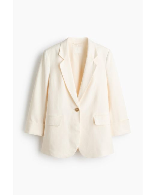 Blazer aus Leinen/Viskose mit Reverskragen und einem Knopf vorn. Schulterpolster und lange Ärmel mit Schlitz. Formgebende Abnäher vorn, Paspeltaschen mit Patte und im Rücken ein Gehschlitz. Gefüttert. Farbe: weiß