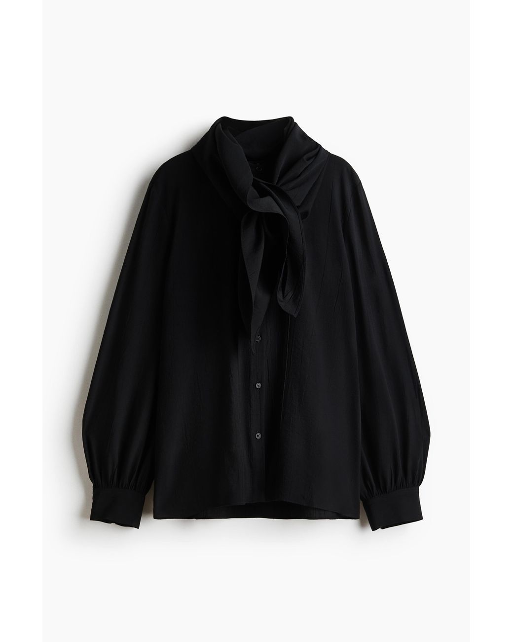 Stoffbluse mit Stehkragen, durchgehender Knopfleiste und einem abnehmbaren Tuch, das im Nacken festgeknöpft wird. Geknöpfte Manschetten und ein gerader Saum. Farbe: schwarz