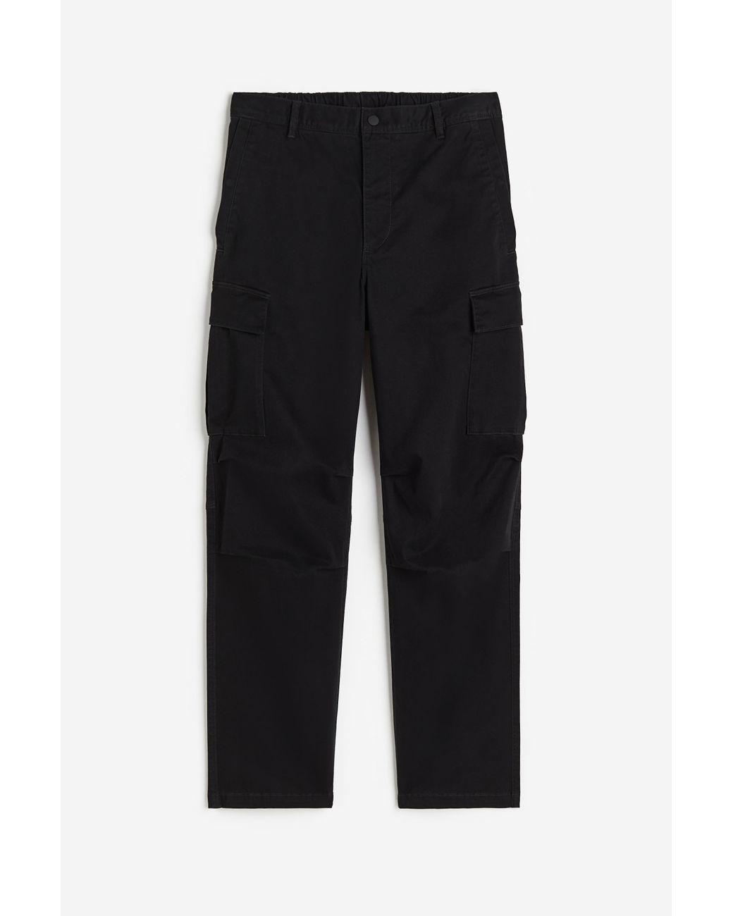 Cargohose aus Baumwolltwill mit genähten Falten an den Knien. Normale Passform. Bund mit Gummizug im Rücken sowie Zip Fly und Druckknopf vorn. Seitliche Leistentaschen mit Druckknopf, Blasebalgtaschen mit Druckknöpfen an den Beinen und Leistentaschen hinten. Farbe: schwarz