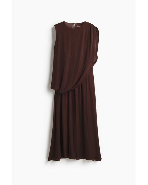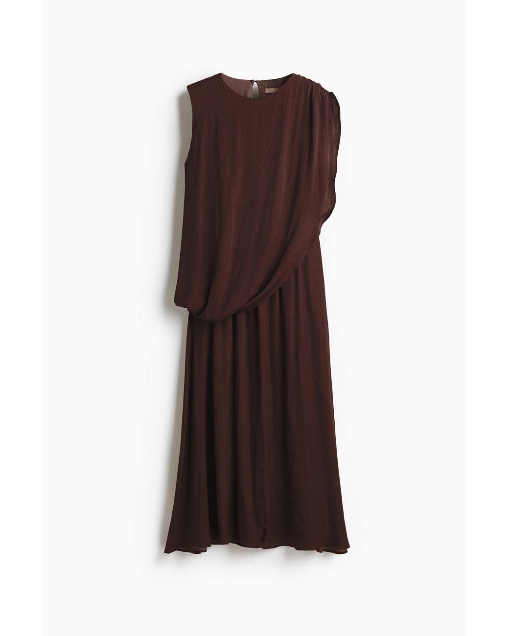 Wadenlanges Kleid aus weich fließendem Satin mit Rundausschnitt und einer Keyhole-Öffnung mit Knopf im Nacken. Locker geschnittenes Oberteil mit Raffungen an einer Schulter und in der Taille für einen lässigen, drapierten Effekt. Leicht ausgestelltes Rockteil mit sanft geschwungenem Saum. Ungefüttert. Farbe: braun