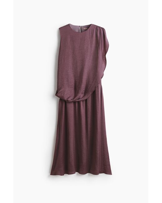 Wadenlanges Kleid aus weich fließendem Satin mit Rundausschnitt und einer Keyhole-Öffnung mit Knopf im Nacken. Locker geschnittenes Oberteil mit Raffungen an einer Schulter und in der Taille für einen lässigen, drapierten Effekt. Leicht ausgestelltes Rockteil mit sanft geschwungenem Saum. Ungefüttert. Farbe: lila