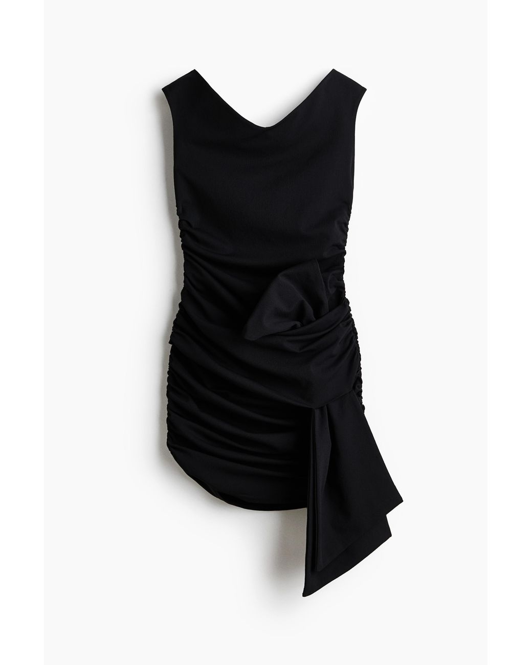 Kurzes, tailliertes Off-Shoulder-Kleid aus Strukturjersey mit einem leicht V-förmigen Ausschnitt, Raffungen an den Seiten für einen drapierten Effekt und einem breiten, asymmetrischen Bindedetail vorn. Farbe: schwarz
