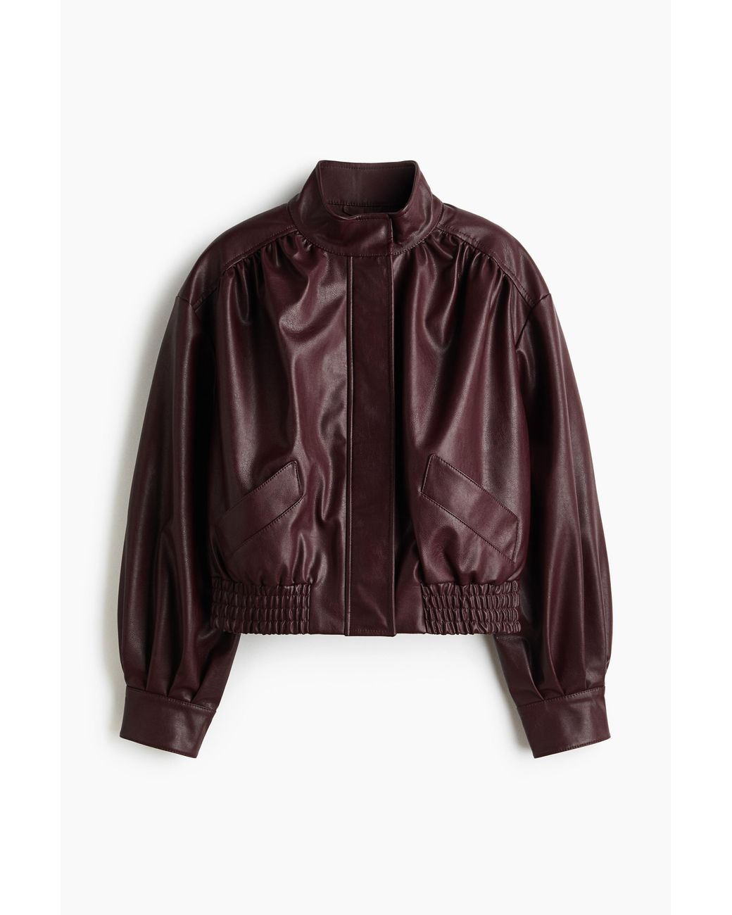 Jacke mit Trichterkragen, Windschutzleiste mit Druckknöpfen, Frontreißverschluss und Leistentaschen. Vorverlegte Schulternähte mit Raffungen, Rückenpasse, überschnittene Schultern und voluminöse Ballonärmel mit verdecktem Druckknopf. Falten im Rücken sorgen für zusätzliches Volumen. Gesmokter elastischer Saum. Gefüttert. Farbe: braun