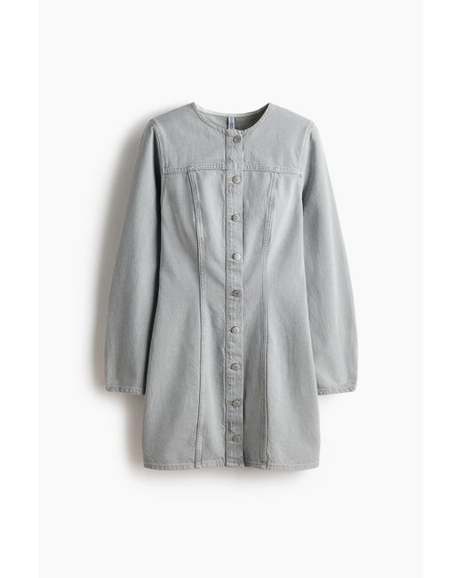 Kurzes, durchgeknöpftes Kleid aus festem Baumwolldenim mit Rundausschnitt und Formnähten an Vorder- und Rückenteil. Lange Ärmel mit Falten an den Abschlüssen für eine leicht schmaler zulaufende Passform. Farbe: grau