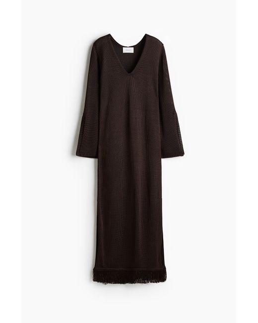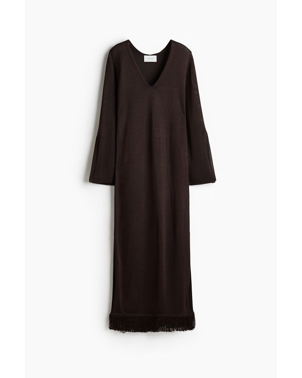 Knöchellanges Kaftankleid aus glänzendem Viskosestrick. V-Ausschnitt, lange Ärmel mit fransenverziertem Schlitz und ein gerader Fransensaum mit hohen Seitenschlitzen. Farbe: schwarz