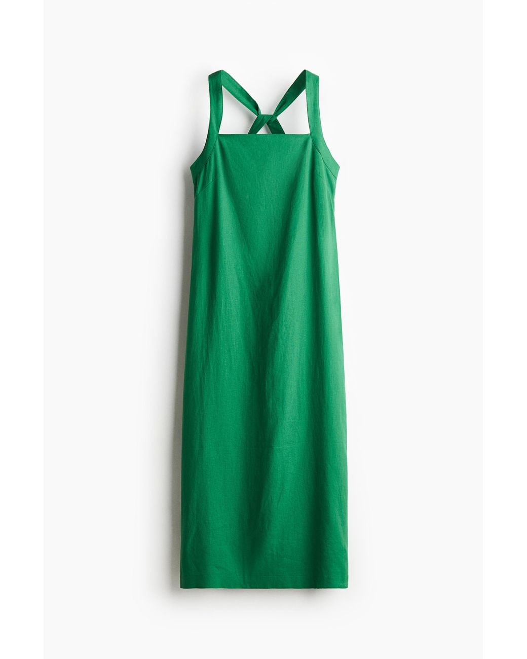 Wadenlanges, tailliertes Kleid aus Leinen/Viskose mit gerader Ausschnittlinie und breiten, im Rücken verschlungenen Trägern. Verdeckter Reißverschluss mit Häkchenverschluss im Rücken und ein gerader Saum mit Gehschlitz. Futter aus Baumwollvoile.