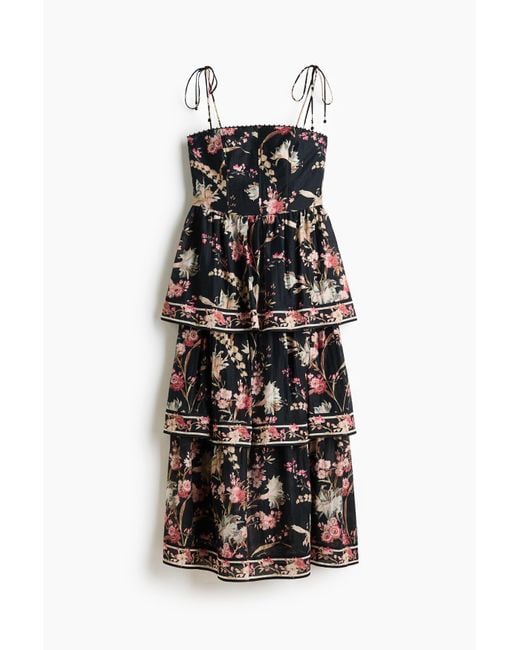 Langes Stoffkleid aus einer Leinenmischung mit Allover-Print. Figurbetontes Oberteil mit Perlenbesatz am oberen Abschluss und verdecktem Rückenreißverschluss. Spaghettiträger zum Binden mit einem Perlenanhänger an den Enden. Ausgestelltes Rockteil mit gerafften Stufen für mehr Volumen. Gefüttert.