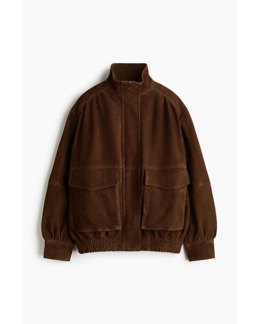 Oversized Jacke aus weichem Veloursleder mit Stehkragen und einer Windschutzleiste mit verdeckten Druckknöpfen und Reißverschluss. Die Rückenpasse und vorverlegten Schulternähte haben Raffungen für zusätzliches Volumen. Große aufgesetzte Vordertaschen mit Patte und verdecktem Druckknopf und Handwärmtaschen darunter. Berschnittene Schultern und voluminöse Ärmel mit sichtbaren Nähten und einem verdeckten Druckknopf an den Manschetten. Elastischer Smokbund. Gefüttert. Farbe: braun