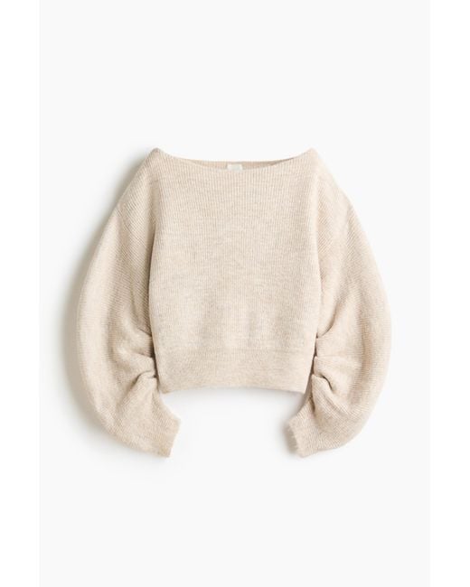 Oversized Pullover aus weichem Rippstrick mit U-Boot-Ausschnitt, überschnittenen Schultern und geschwungenen Ärmeln, die sich zum Bündchen hin verjüngen. Farbe: natur