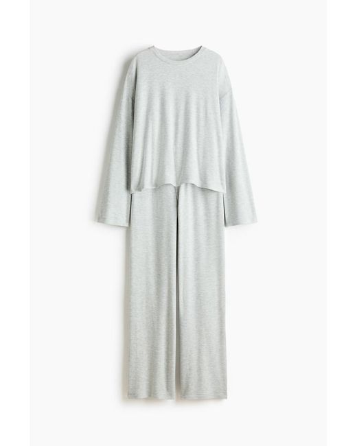 Schlafanzug aus weich angerautem Jersey. Oberteil mit Rundausschnitt, Langarm und überschnittenen Schultern. Dazu die Hose mit elastischem Bund, Fake Fly und Zierknöpfen. Farbe: weiß