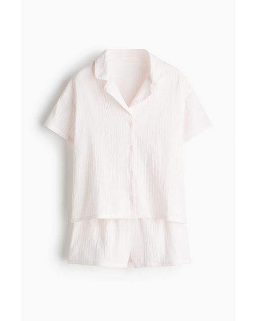 Schlafanzug mit Oberteil und Shorts aus weichem Baumwollmusselin. Oberteil mit Kurzarm, Reverskragen und Knopfleiste. Gerader Saum mit kleinen Seitenschlitzen. Dazu die Shorts mit verdecktem Gummizug im Bund und kleinen seitlichen Saumschlitzen. Farbe: weiß