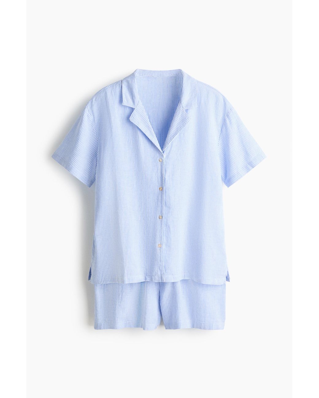 Pyjama aus einem luftigen Leinen/Viskose-Gemisch. Kurzarmoberteil mit Reverskragen, Knopfleiste und geradem Saum mit seitlichen Schlitzen. Dazu die Shorts mit elastischem Bund und Kordelzug. Farbe: blau