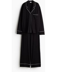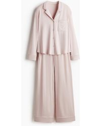 Weiter zu H&MJersey-Schlafanzug mit einem Langarmoberteil und einer Hose aus einer weichen Viskosemischung. Oberteil mit Reverskragen und Knöpfen vorn. Hose mit verdecktem Gummizug im Bund und weitem, geradem Bein. Farbe: grau