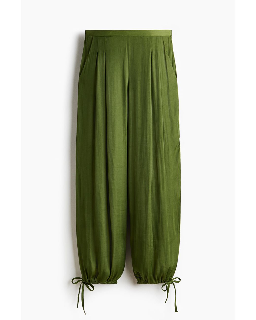 Hoch taillierte Stoffhose in Loose Fit mit bezogenem Gummizug hinten am Bund, schrägen Seitentaschen und geradem Bein mit Falten vorn und Kordelzug unten zum Anpassen der Passform. Farbe: grün