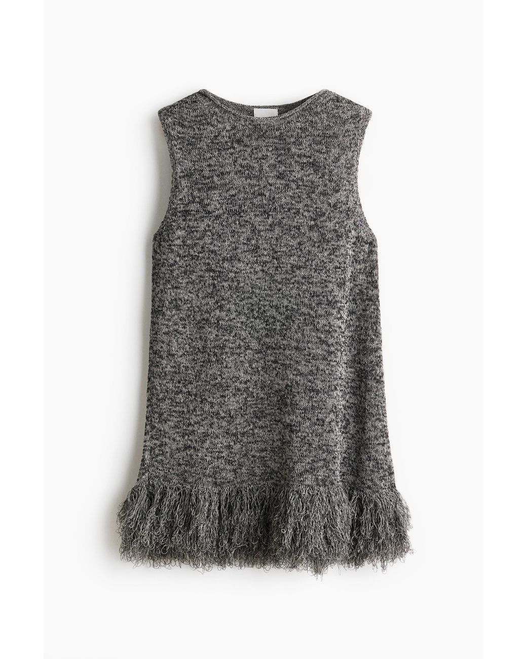 Langes Top aus weichem Strick mit Rollkante am Rundausschnitt und einem breiten Fransenbesatz am Saum. Farbe: grau