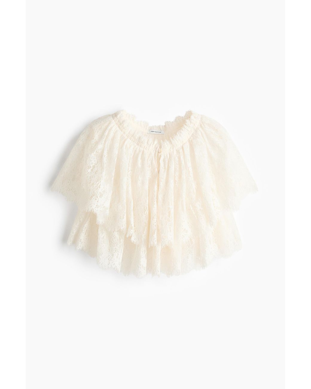 Crop-Top aus Spitze im Lagenlook mit Volantbesatz am Halsausschnitt, bezogenen Knöpfen vorn und V-förmigem Saum. Farbe: natur