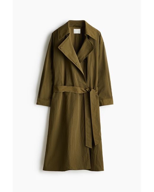 Locker geschnittener Trenchcoat aus Nylon mit Kragen und verdeckten Druckknöpfen vorne. Berschnittene Schultern, verstellbare Druckknöpfe an den Manschetten und ein Bindegürtel in der Taille. Im Rücken ein Koller und ein Gehschlitz. Gefüttert. Farbe: grün