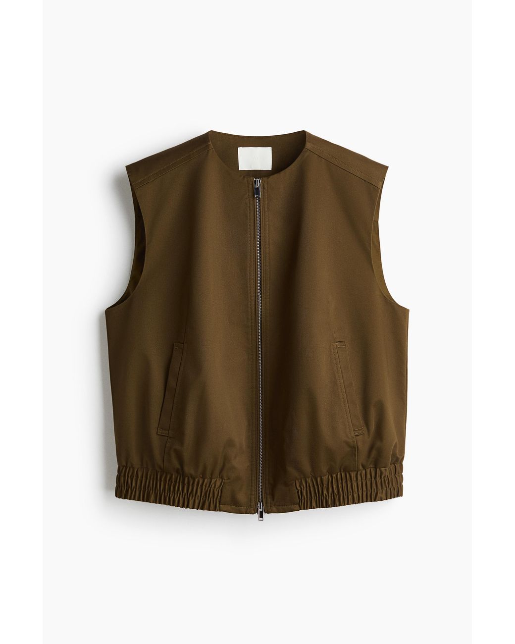 Twillweste mit Rundausschnitt und Zweiwegereißverschluss. Rückenpasse, vorverlegte Schulternähte und seitliche Leistentaschen. Elastischer Smokbund. Gefüttert. Farbe: braun