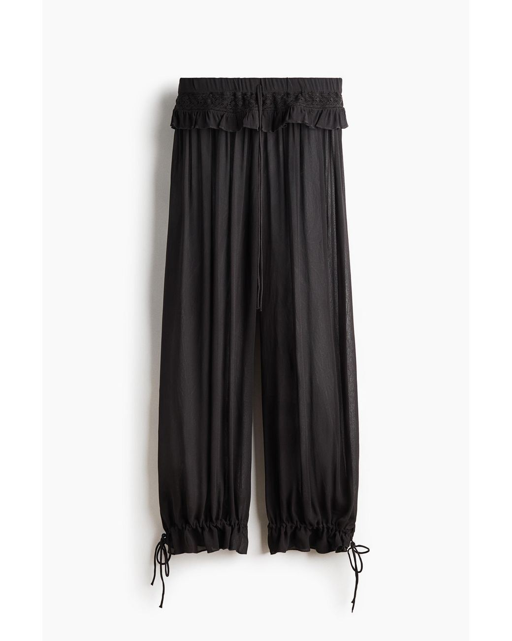 Zarte Chiffonhose aus Viskose mit elastischem Kordelzugbund mit Spitzenborte und Volantbesatz. Balloon Leg mit Kordelzug am Knöchel und Volantbesatz am Abschluss. Ungefüttert. Farbe: schwarz