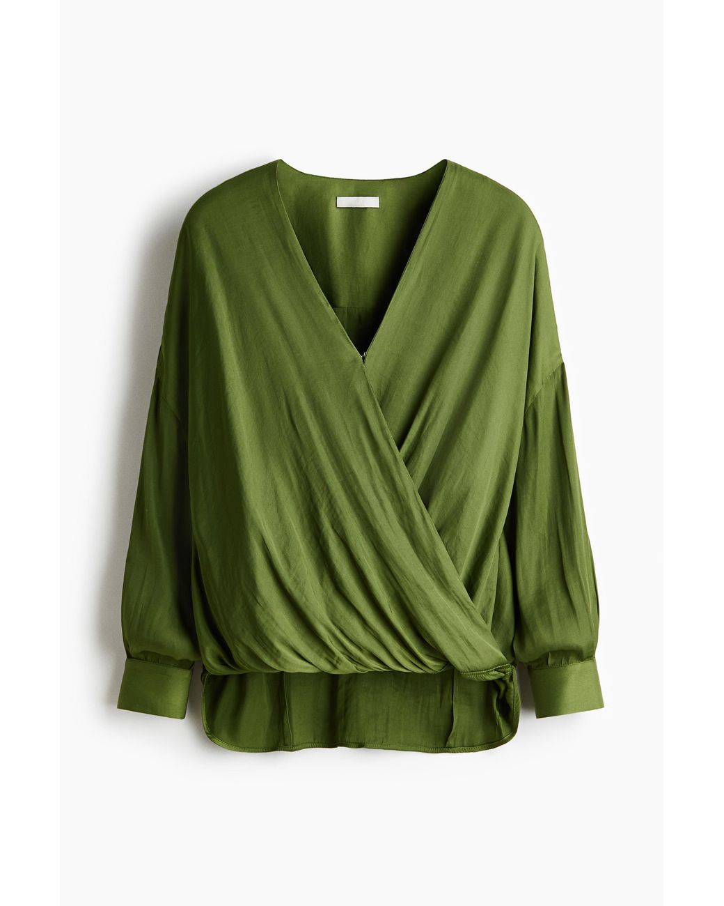 Legere Stoffbluse im Wickelschnitt mit tiefem V-Ausschnitt, Rückenpasse, stark überschnittenen Schultern und geknöpften Manschetten. Ballonsaum vorn und ein längeres, abgerundetes Rückenteil. Farbe: grün