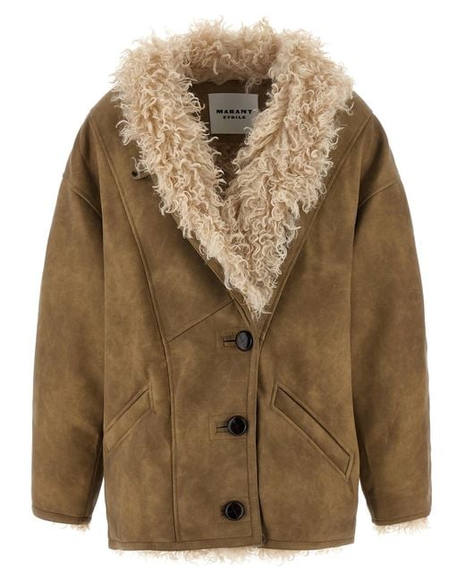 Clea' Suede Effect Stoffmantel mit Shearling-Effekt-Stofffutter, Schalkragen, Vorderknopfverschluss, Taschen, lange Ärmeln mit abgesetzten Schultern. Marant Etoile. Clea' Jacke. Bergroße Passform - Französische Größe. Farbe: grün