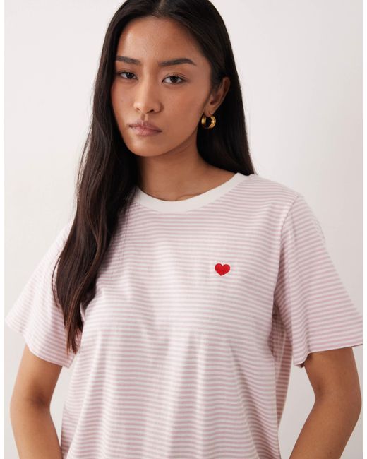 Oberteile von JDY Rundhalsausschnitt Kurzärmlig Herzstickerei auf der Brust Streifenmuster Normale Passform. Farbe: pink