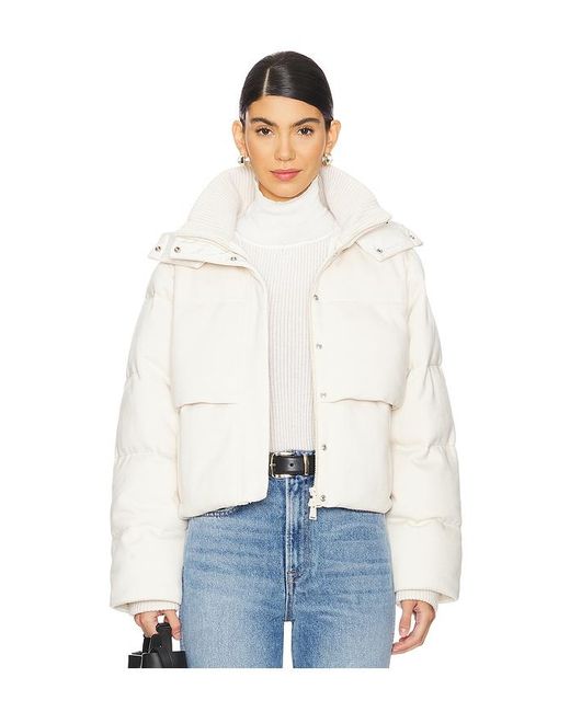 SIMKHAI STEPPJACKE LANA in Cream. Größe L. Also in M. SIMKHAI STEPPJACKE LANA in Cream. Size M. Hergestellt in China. Chemische Reinigung. Hidden front zipper and button snap closures. Stand collar design with hood. Seitennahttaschen mit Reißverschluss. Jersey fabric with padded lining and ribbed knit fabric at collar and cuffs. JSKI-WO52. 524-6056-O. Farbe: weiß