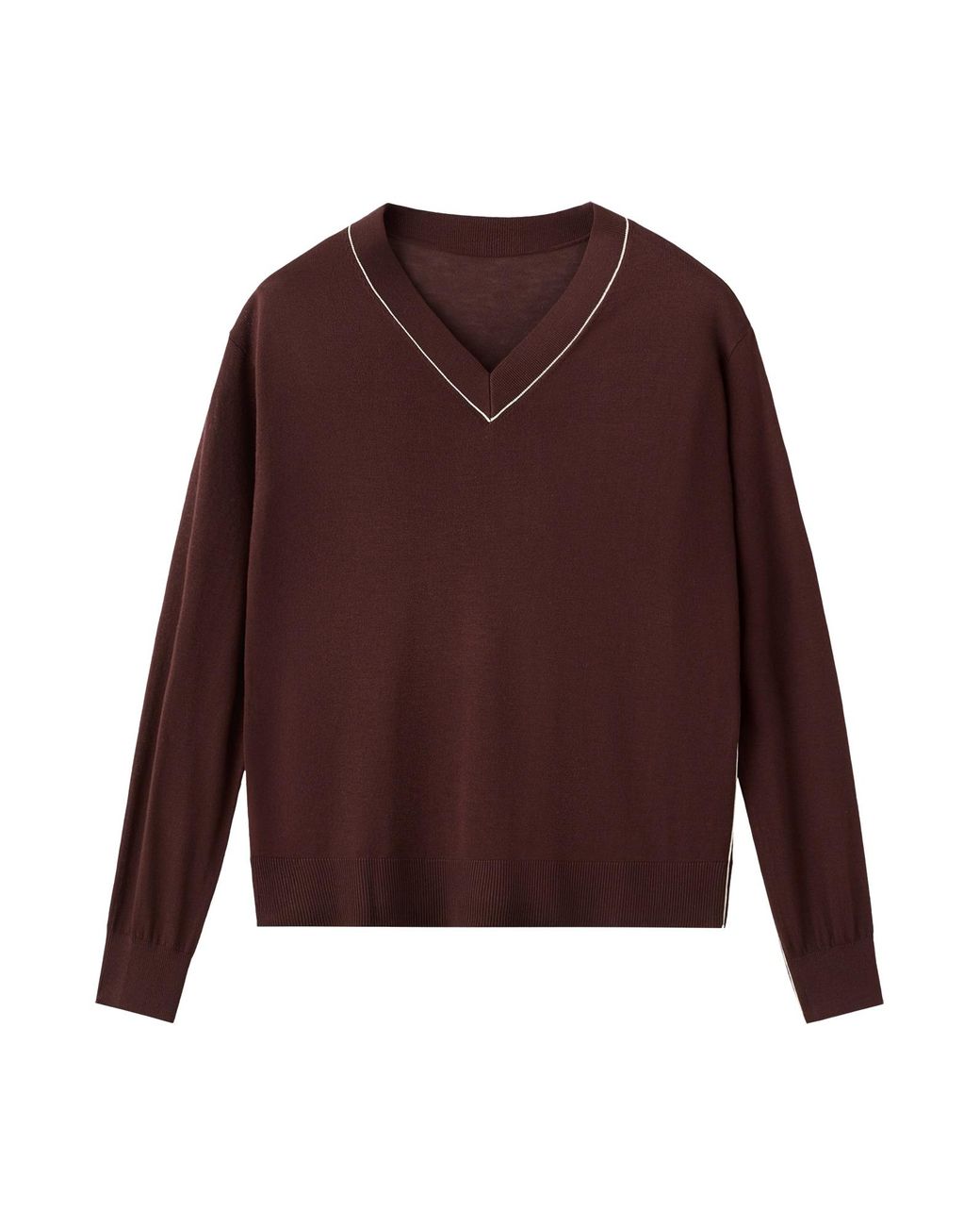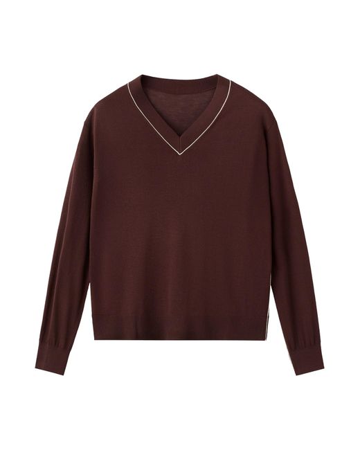Design: Bündchen-/Rippstrick-Kragen, Rippbündchen, Kontrastfarbene Einsätze; Material: Strick; Ausschnitt: V-Ausschnitt; Muster: Unifarben; Details: Seitenstreifen; Extras: Fully fashioned, Weicher Griff; Passform: Lockere Passform; Ärmellänge: Langarm; Länge: Normale Länge Farbe: lila