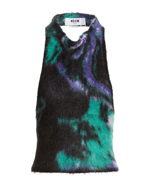 MSGM. Crop Top, Samt, Multicolor-Print, Rückenausschnitt, Neckholder, ärmellos, Chemische Reinigung, nicht Bleichen, Trockner ungeeignet. 38% Acryl, 32% Polyamid, 30% Superkid Mohair. Farbe: blau