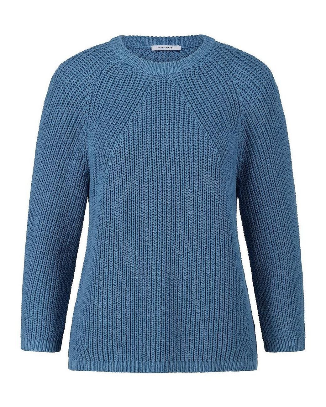 Rundhals-Pullover von PETER HAHN mit 3/4-Raglanarm. Schlicht, puristisch und ausgesprochen edel. Ein Sommerpullover in reiner Naturqualität aus 100% Baumwolle. Etwas kürzere, moderne Boxy-Form in sportivem Perlfangstrick mit formgebenden Minderungen und gerippten Abschlüssen. Länge ca. 56 cm. Dieser Rundhals-Pullover ist maschinenwaschbar. Schonwaschgang 30°. Chlorbleiche nicht möglich. Mäßig heiß Bügeln. Reinigung P schonend. Trocknen im Tumbler nicht möglich. Farbe: Rauchblau. Erhältlich in den Größen: 36, 38, 40, 42, 44, 46, 48, 50, 52