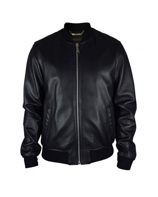 Philipp Plein Bomber Jacke in schwarzem Leder. Mehrfarbige Schreibabbildung auf der Rückseite. Schwarzes Elastiz an der Taille und den Manschetten. Reißverschluss. In Italien gemacht.