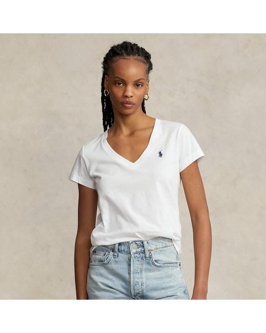 Damen Baumwolljersey-T-Shirt Mit V-Ausschnitt in weiß