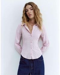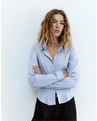 Weiter zu ASOSOberteile von Pull&Bear Breiter Kragen Knopfleiste Langärmlig Faltendetails Schmale Passform. Farbe: weiß