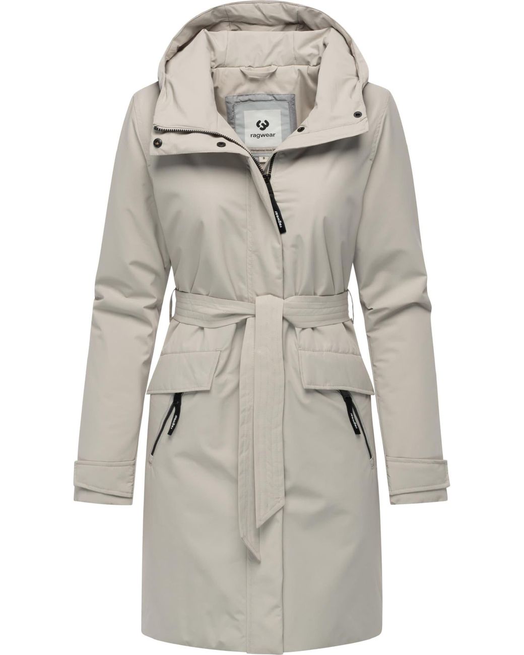 Mantelart: Trenchcoat; Design: Druckknopfleiste, Gehschlitz, Kapuze mit Stehkragen, Verdeckter Reißverschluss, Patten-/Klappentaschen, Seitliche Reißverschlusstaschen, Taillengürtel, Verstellbare Kapuze; Verschlussart: Reißverschluss; Fütterung: Warm gefüttert; Muster: Unifarben; Extras: Label Patch/Label Flag, Ton-in-Ton-Nähte, Glatter Stoff, Gürtelschlaufen; Passform: Schmale Passform; Länge: Kurzer Schnitt Farbe: grau