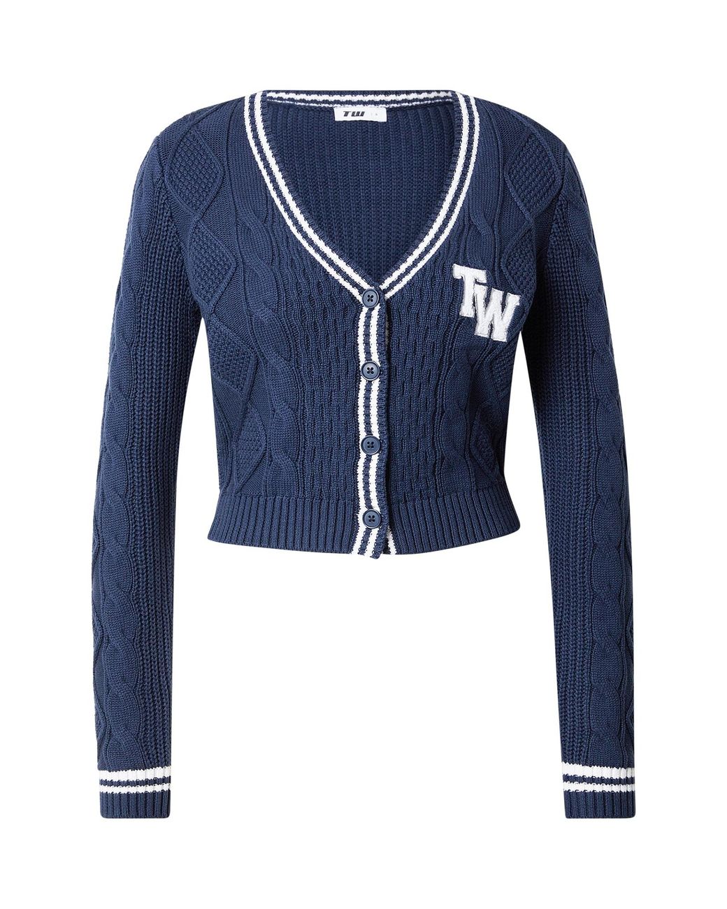 Design: Bündchen-/Rippstrick-Kragen, Gerader Saum, Knopfleiste, Rippbündchen, Zopfstrick; Verschlussart: Knopfverschluss; Material: Strick; Ausschnitt: V-Ausschnitt; Muster: Unifarben; Extras: Fully fashioned, Label Patch/Label Flag, Strukturierter Griff, Weicher Griff; Passform: Schmale Passform; Ärmellänge: Langarm; Länge: Kurzer Schnitt Farbe: blau