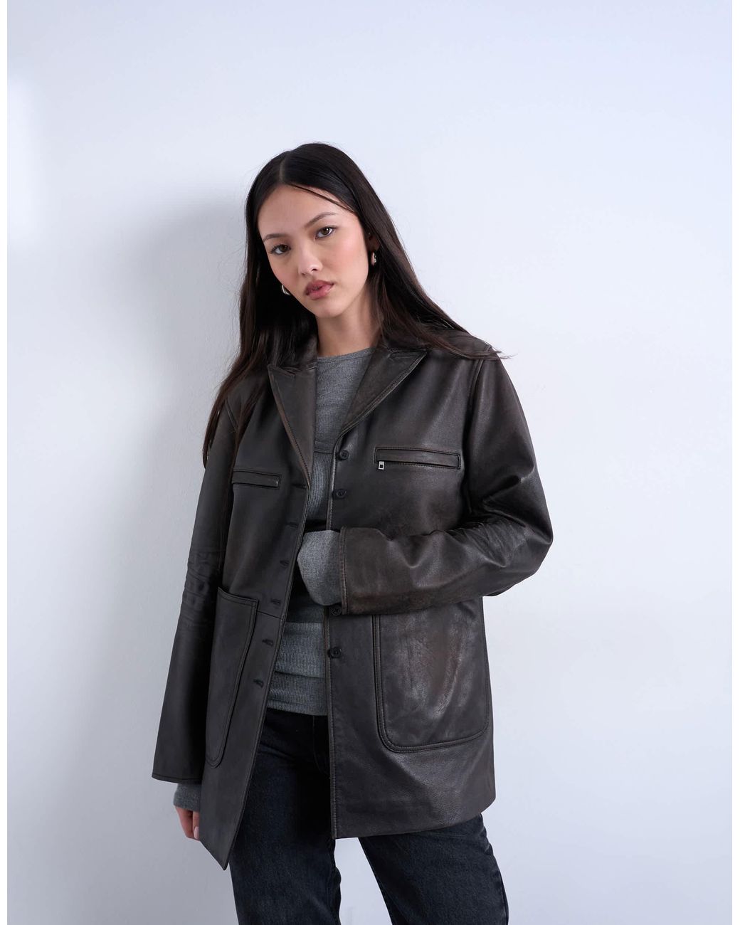 Mäntel & Jacken von Topshop Dieser Blazer hat ein verwaschenes, mattes Finish. Das Modell verfügt über ein Spitzrevers, eine Knopfleiste, aufgesetzte Taschen und eine normale Longline-Passform. Farbe: schwarz