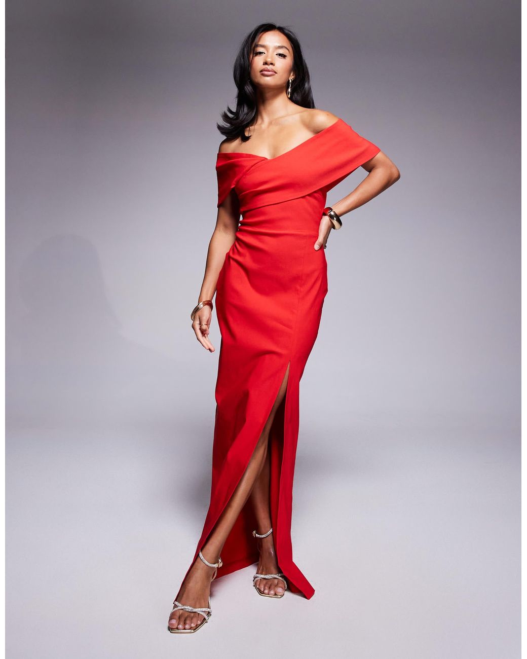 Kleider von Vesper Petite Schlichtes Design Off-Shoulder-Stil Vorderpartie im Wickelstil Reißverschluss hinten Seitlicher Schlitz Normale Passform. Farbe: rot