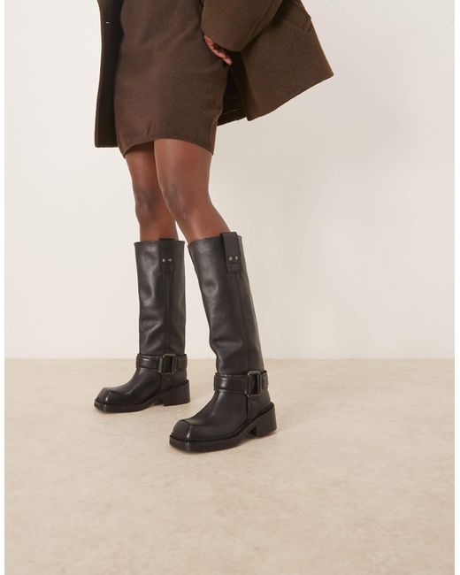 Schuhe von ASOS DESIGN kniehohes Design Zuglaschen für einfaches An- und Ausziehen Zierschnallen Eckige Zehenpartie niedriger Blockabsatz. Farbe: natur