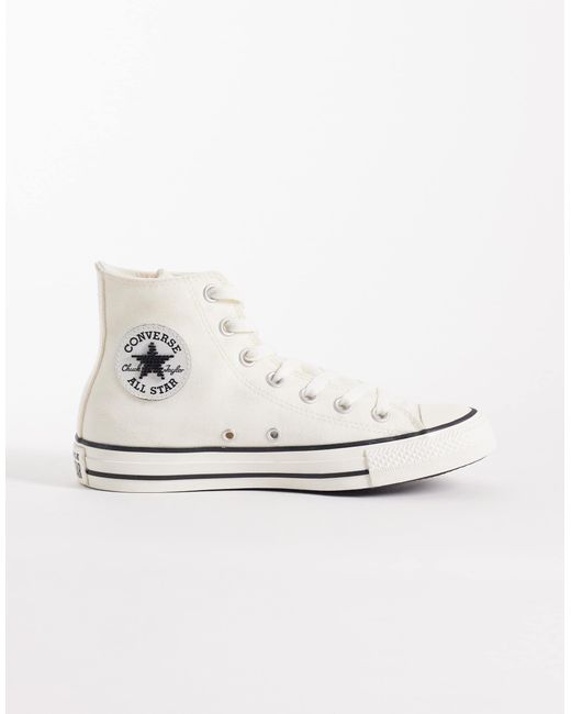 Schuhe von Converse hoher Schaft Zum Schnüren Markentypisches Converse All Star-Logo Belüftungsösen innen am Fuß Zehenkappe und Außensohle aus vulkanisiertem Gummi Perlenverzierung geometrisches Profil. Farbe: weiß