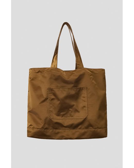 Tote Bag aus glattem Nylon mit Tragegriffen. Aufgesetzte Tasche auf der Vorderseite und ein elastischer Kordelzugverschluss mit Kordelstopper. Farbe: braun