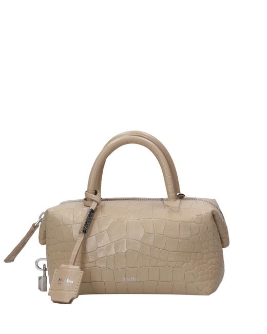 Kalbsleder - Krokodilprägung - Innenseite aus Wildleder - Überkopf-Reißverschluss und passender abnehmbarer kurzer Schultergurt - Feste Griffe mit Druckknopfring gehalten - Abnehmbarer Lederschultergurt - Semianellen für Schultergurt und kleine Lederwaren - Aufgesetzte Innentaschen - Lederfüße - Max Mara-Logo auf der Vorderseite aufgedruckt - Abmessungen: L 37 cm H 18 cm T 17 cm – Gewicht: 940 g. Farbe: natur